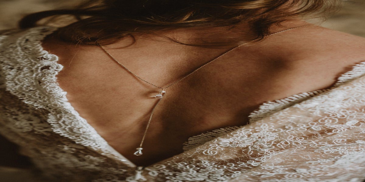 Chaine fine avec à l'avant, au milieu dos et en pendant final une Goutte en cristal surmontée d'une Perle nacrée de 4 mm.